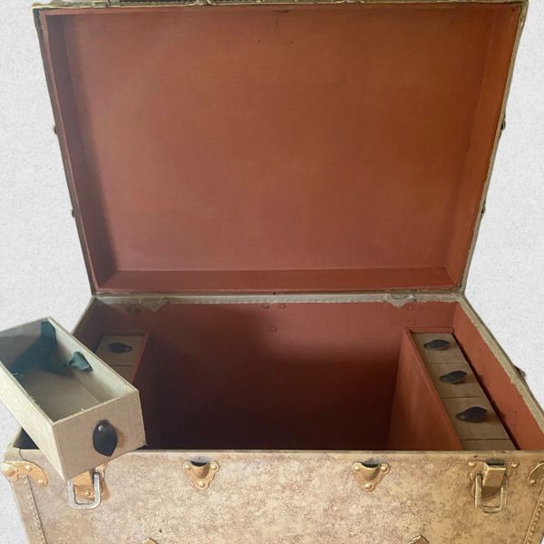Beautifully refurbished Marshall Fields storage trunk c 1920. The large size would work well at the foot of the bed or anywhere in the home. It's most unique feature are the eight interior lift-out shoe compartments along with spacious storage.