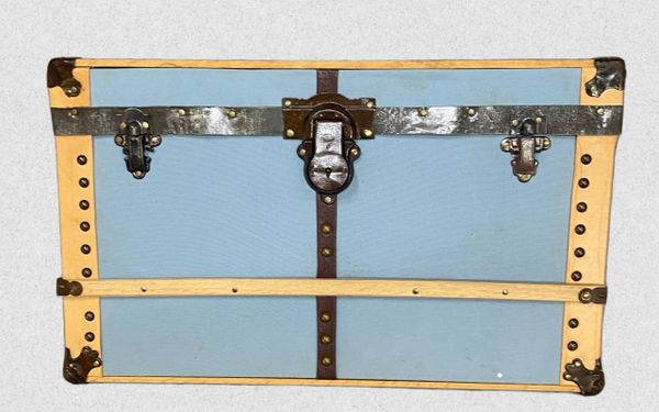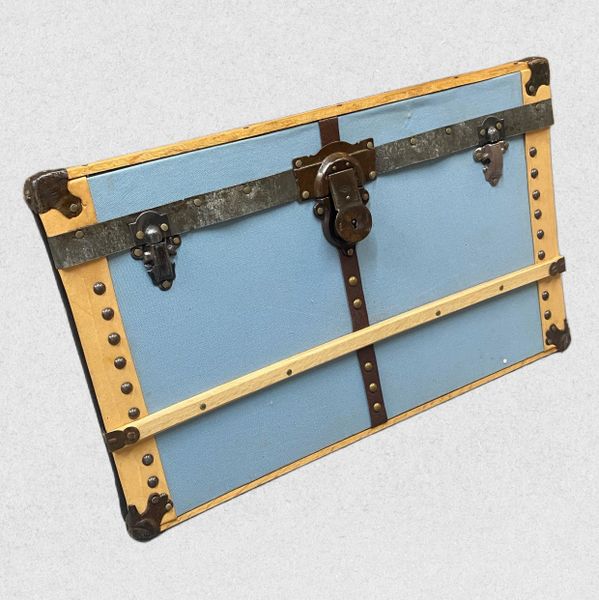 Trunk Face Wall art. The trunk you can hang on your wall! With baby blue cotton duck fabric, genuine leather binding and all of the genuine antique trunk hardware of a real trunk! Complete with ready to hang hardware and felt backing, this piece will add character to any room in the home or office.